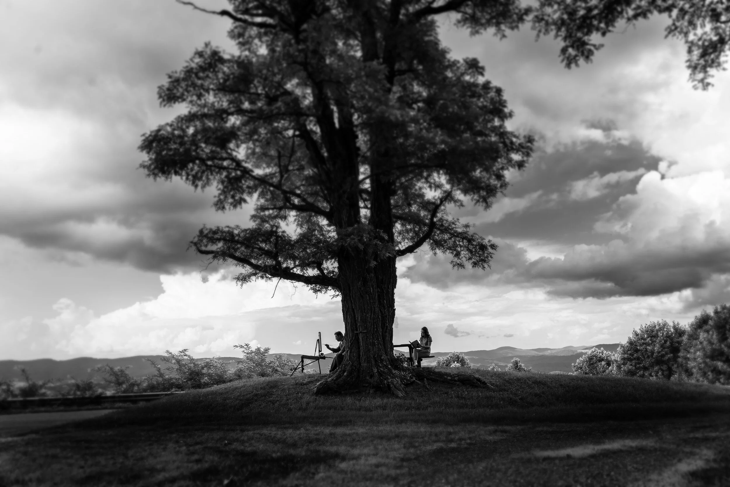 It’s been over a month since we arrived back on the east coast. We were itching to get back to plein air painting, so we decided to take “The Scout”—that’s what we call our little travel trailer—up to Virginia and park her on a private lot right next to a river. From the moment we arrived Eric knew exactly what he wanted to paint. This tree with its branches reaching across the water was a juxtaposition of gentle power.